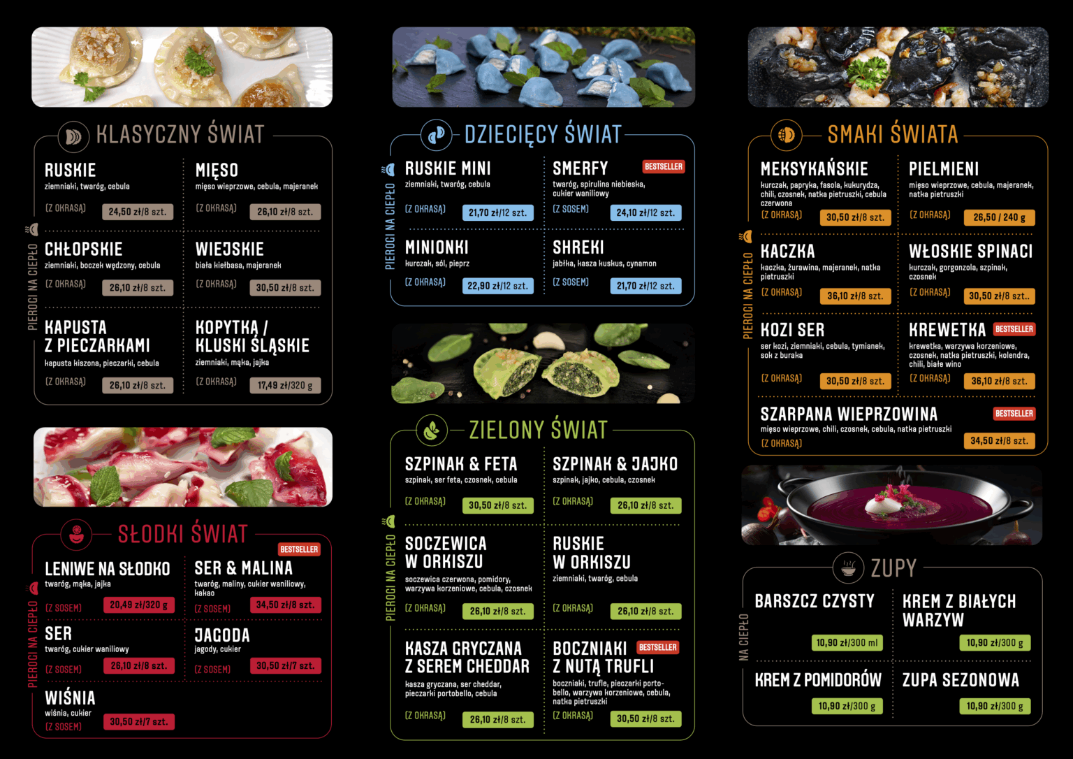 Fantazyjne i supersmaczne pierogi! Wersja z mięsem z kaczki oraz wersja włoska to niebo w gębie! Do tego świetne sosy - u nas chrzanowy i gorgonzola były świeże i wspaniale pasujące do dań. Na uwagę zasługują też surówki - ta z kapusty kiszonej to cudownie doprawione cudo! 🙂 Polecam, polecam, polecam! Na drugi dzień znów jest ochota na eksperymenty smakowe ze Światem Pierogów. 😉